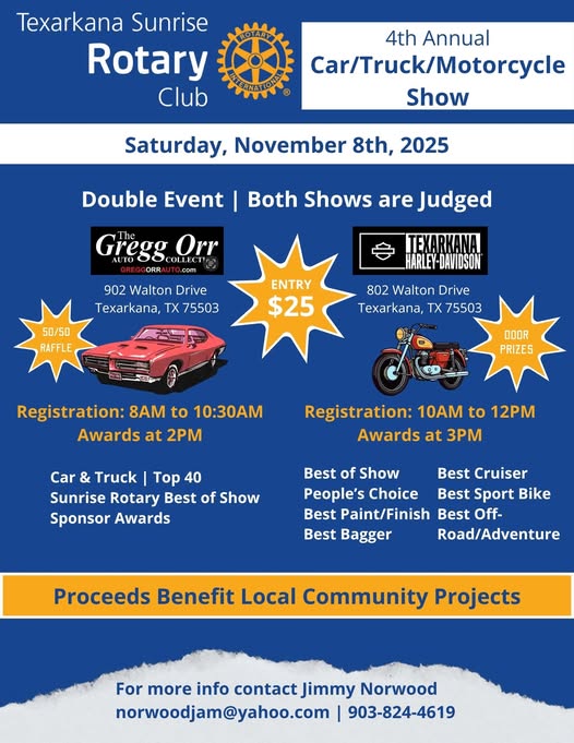 We are excited to announce our upcoming car show on Saturday, October 21st! We had a blast last year and look for this year's event to be even bigger! For more info, or if you'd like to be a sponsor, please reach out to Jimmy Norwood or send us a private message! Car Show sponsorships of $200.00 or more would be appreciate email @ texarkanasunrise@gmail.com